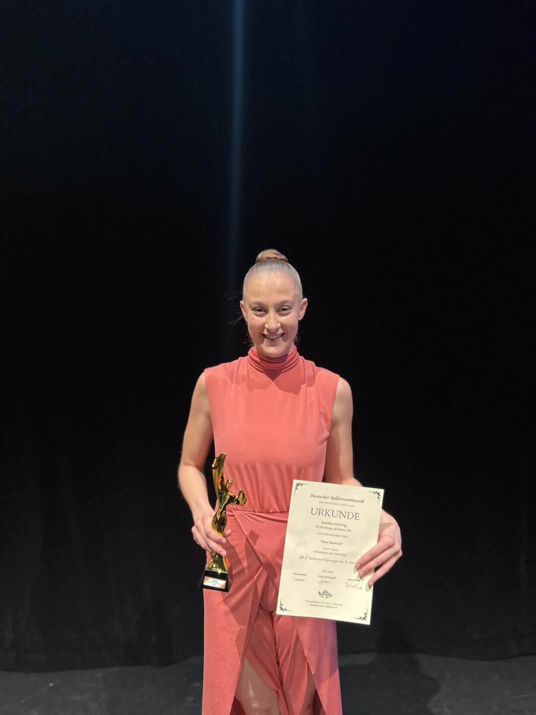 Martha Ostertag erreichte mit herausragenden 91,7 Punkten die höchste Wertung und sicherte sich souverän den Deutschen Meistertitel. - 1. Platz – Gruppe Juniorinnen (JGA Acrobatic Dance):